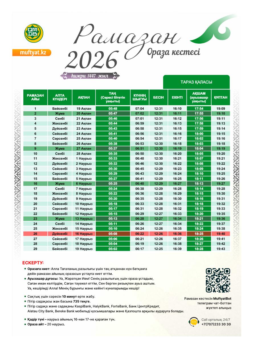 Кестені https://www.muftyat.kz/kk/page/web/ramadan/ сілтемесіне өтіп, қажетті өңірді таңдау арқылы жүктей аласыз. Алла Тағала ниетіңізді қабыл етсін!