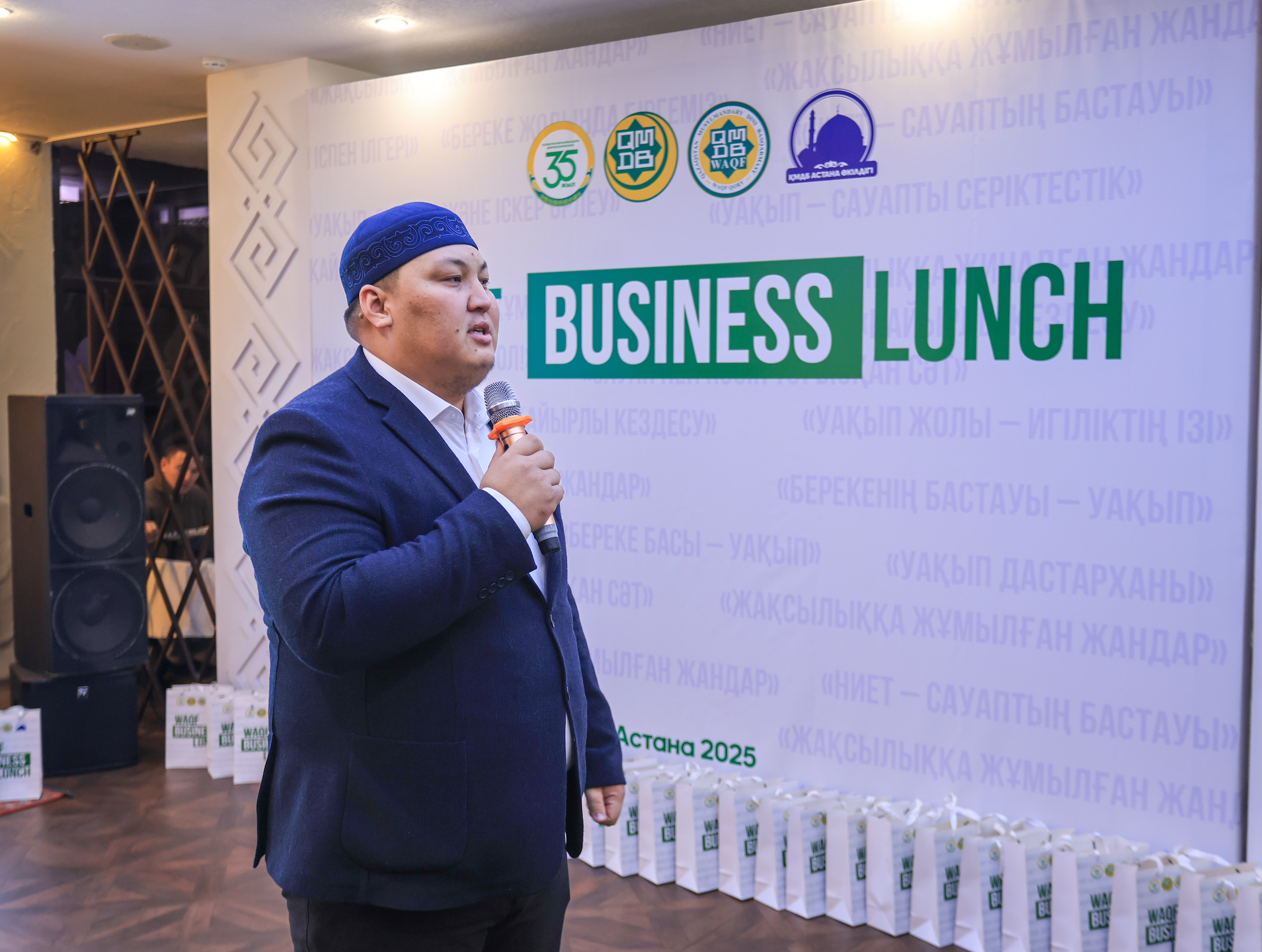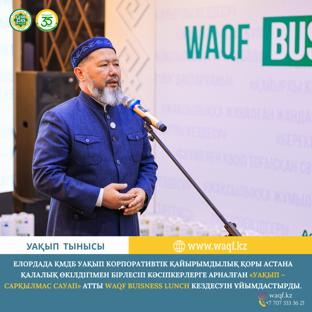 Жиынға Қазақстан мұсылмандары діни басқармасының Төрағасы, Бас мүфти Наурызбай қажы Тағанұлы қатысып, Діни басқарманың негізгі жұмыс бағыттары мен уақып мәдениетінің қоғамдағы орнына тоқталды. Бас мүфти кәсіпкерлердің елдің рухани дамуына қосып жүрген үлесін атап өтіп, олардың қайырымды істеріне ризашылығын білдірді.