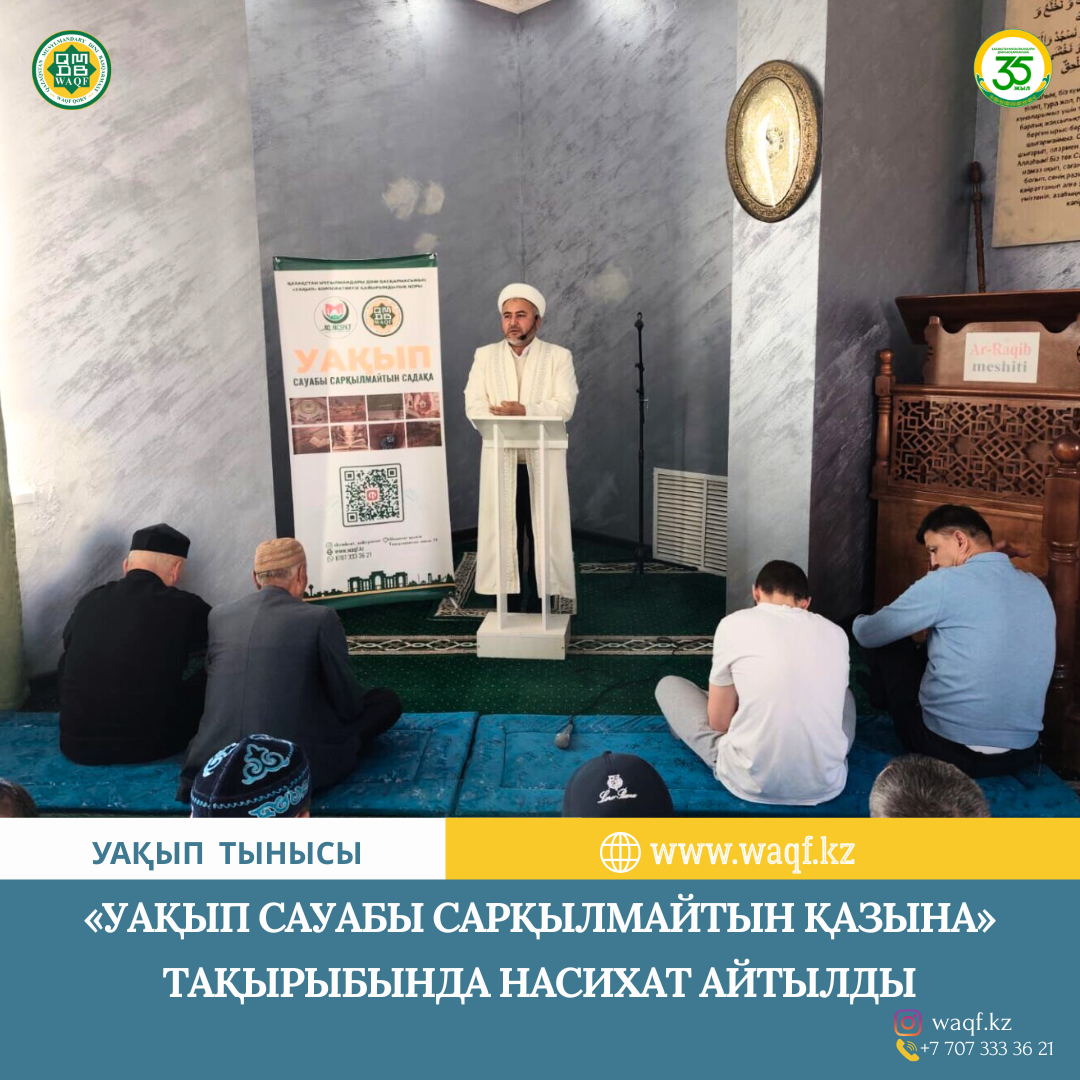 Еңбекші ауданы бойынша уақып істерінің жетешкісі Маметов Исматулла Әр-Рақиб мешітінің жамағатына Қазақстан мұсылмандары діни басқармасының атқарған уақып істеріне қатысты іс-шараларын баяндап, уақып жасаудың діндегі орнын насихаттады.