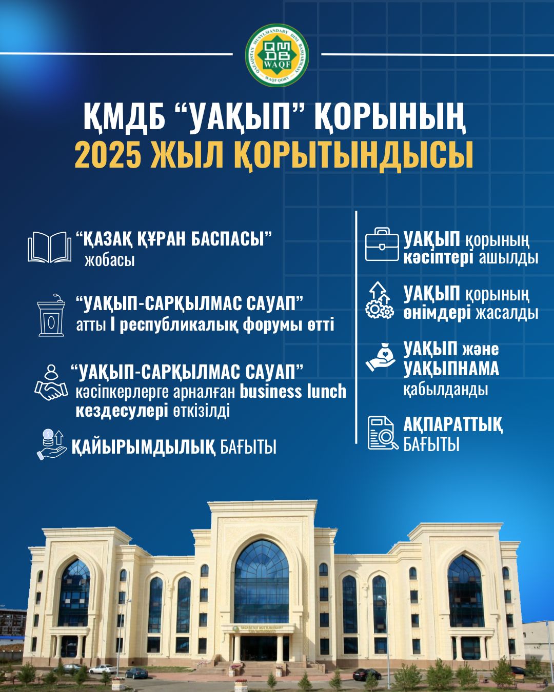 Новости 13 января 2026 Просмотров: 489 Қазақстан Мұсылмандары Діни басқармасы жанындағы “Уақып” корпоративтік қайырымдылық қорының 2025 жылдық қорытынды есебі