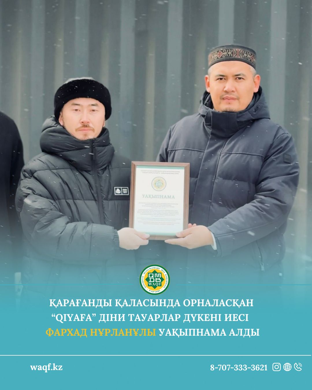 Новости 14 января 2026 Просмотров: 200 Қарағанды қаласында орналасқан «QIYAFA» діни тауарлар дүкенінің иесі Фархад Нұрланұлы игі ниетпен уақыпнама алды