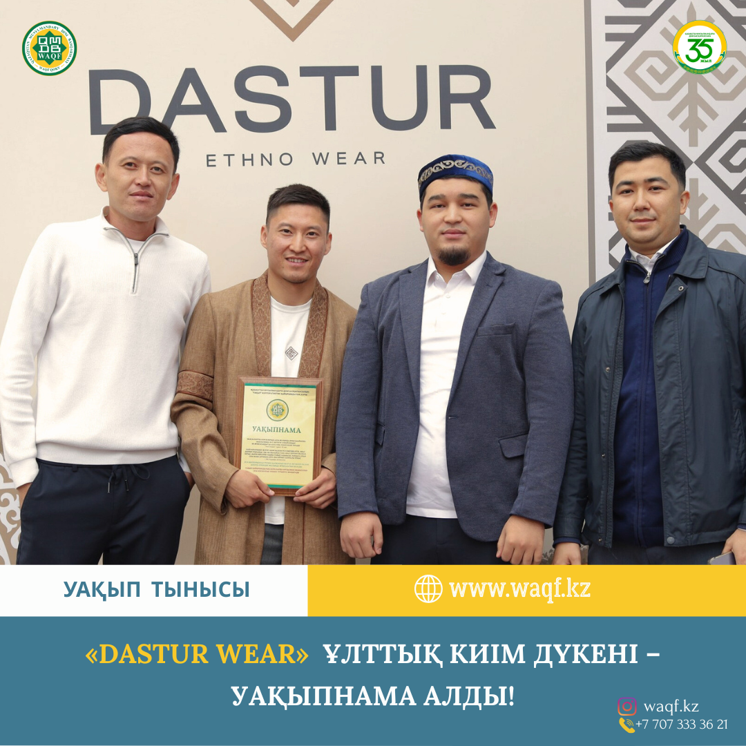 Астана қаласында жаңа ашылған “Dastur wear” ұлттық киім дүкенінің ашылу салтанатында дүкен иесіне Уақып корпоративтік қайырымдылық қорының Уақыпнамасы табысталды.