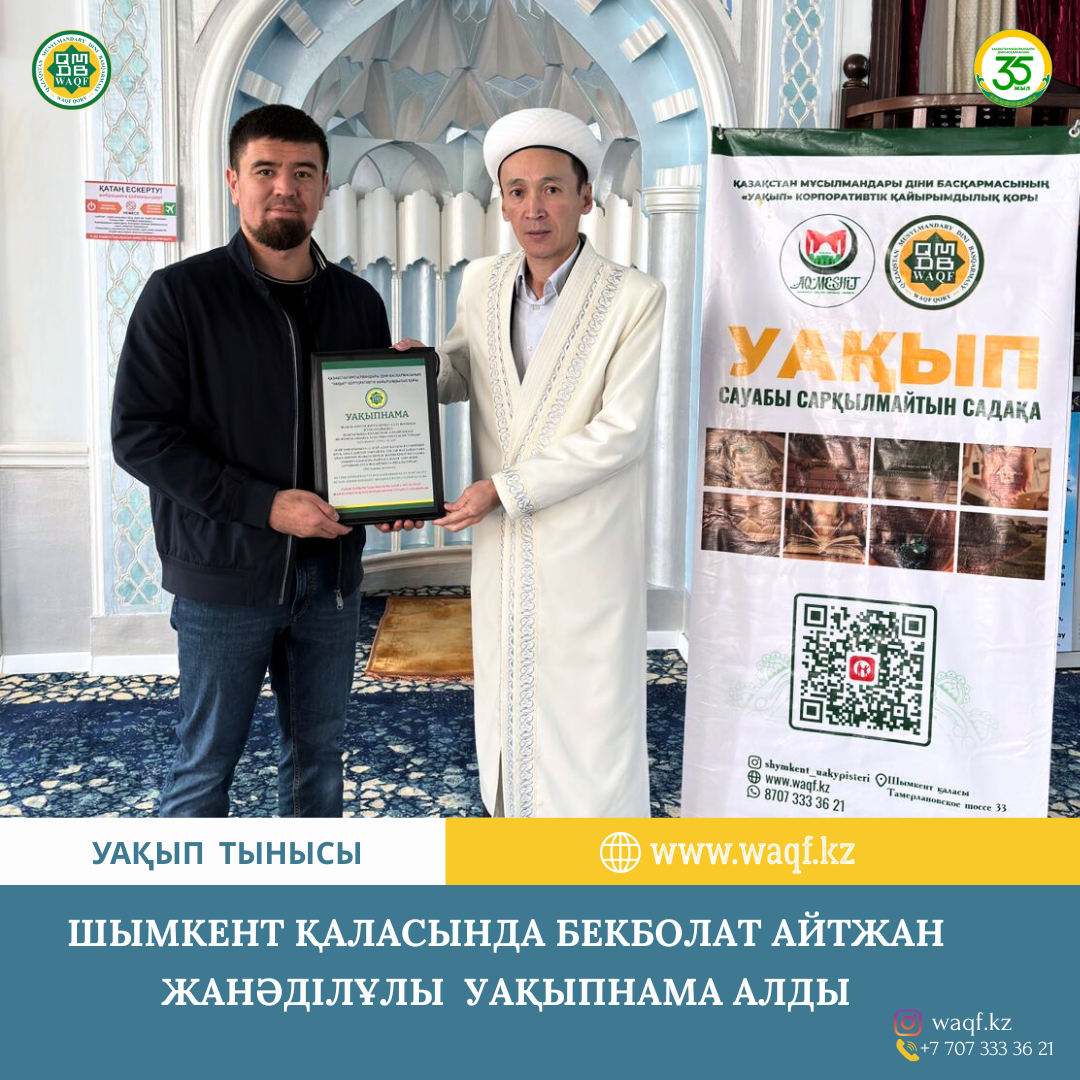 Кәсібінің табысынан ай сайын белгілі бір бөлігін Уақып қоры арқылы қайырымдылық пен рухани жобаларға арнап отыруы — азаматтық жауапкершіліктің жарқын үлгісі.