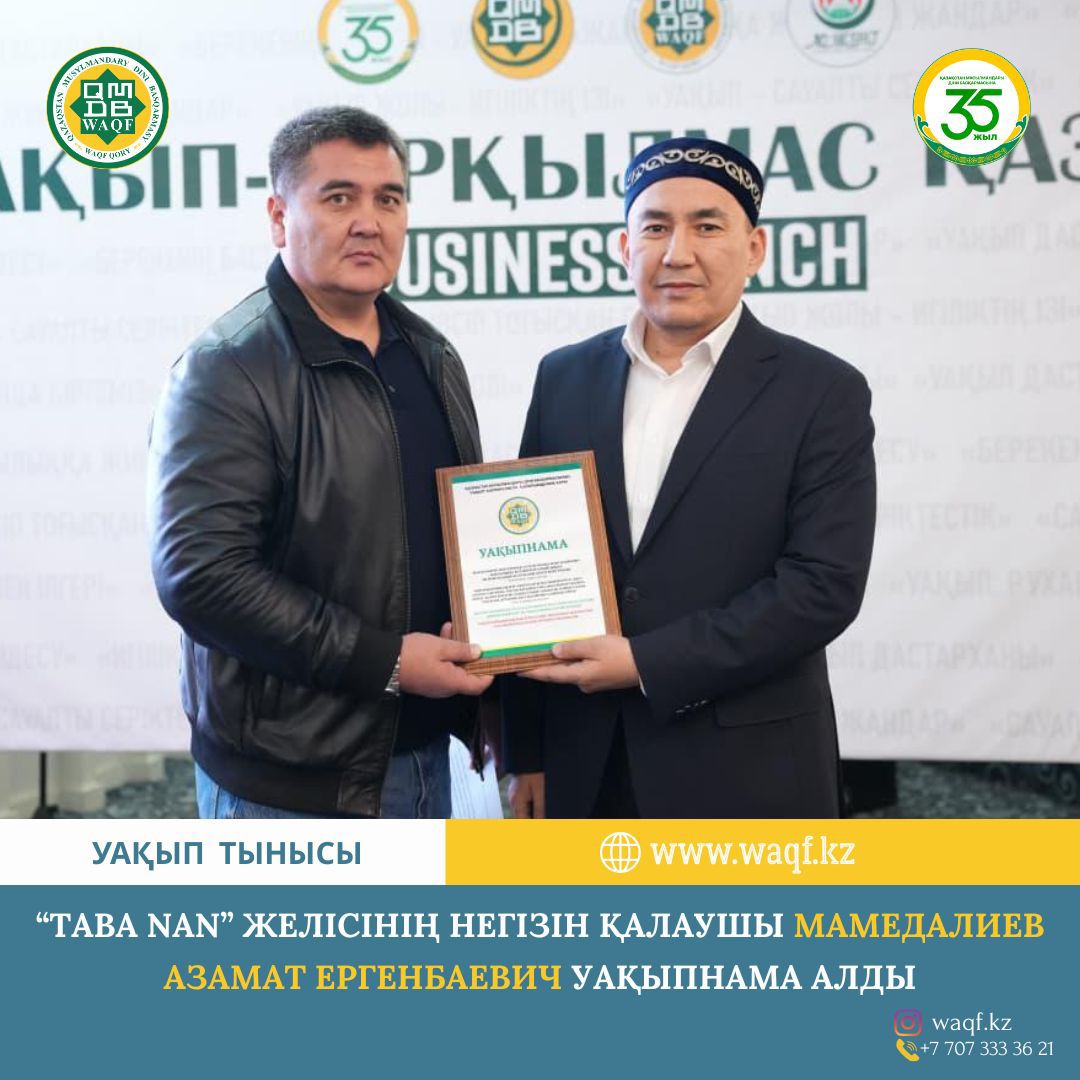 Шымкент қаласында өткен «Уақып - сарқылмас қазына» атты Business Lunch жиынында Қазақстан бойынша танымал “TABA NAN” нан өнімдері желісінің негізін қалаушы Мамедалиев Азамат Ергенбаевичке Уақыпнама салтанатты түрде табысталды.
