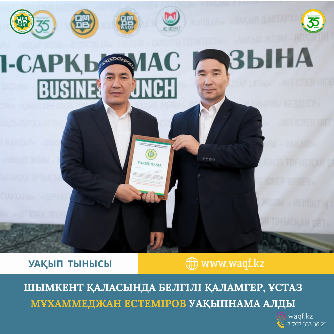 Шымкент қаласында ҚМДБ «Уақып» корпоративтік қайырымдылық қорының жұмыс жоспары бойынша «Уақып - сарқылмас қазына» атты кәсіпкерлерге арналған BUSINESS LUNCH шарасы аясында елге кең танымал, ұлағатты ұстаз, қаламгер Мұхаммеджан Жамантайұлы Естеміровке Уақыпнама ресми түрде табысталды.