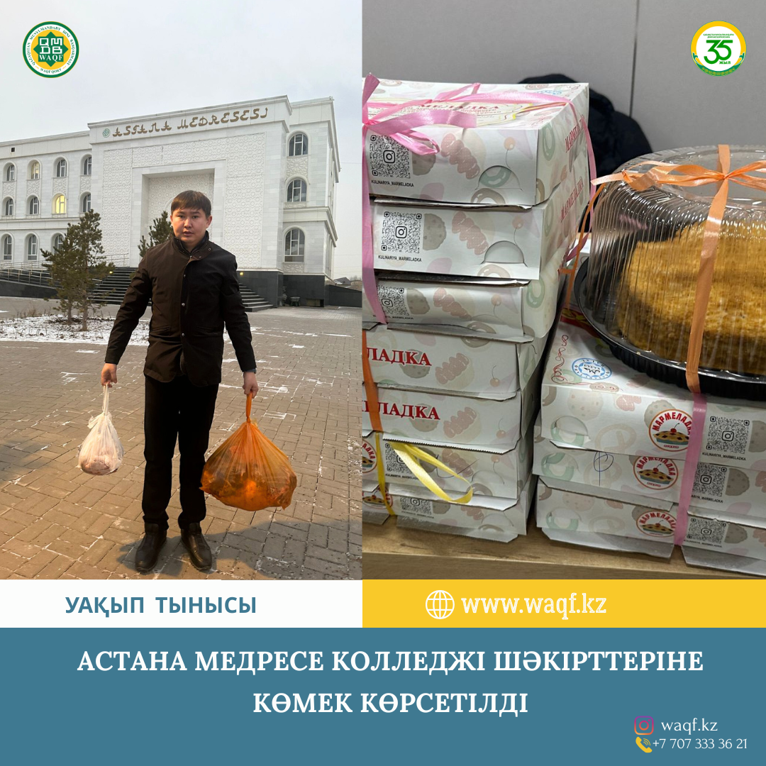ҚМДБ Астана қаласы өкілдігі, қала бойынша Уақып қорының жауапты маманы – Оразбай Нұрбол Қабланұлының ұйымдастыруымен, Астана медресе колледжінің шәкірттеріне тәттілер мен ет түріндегі қайырымдылық көмек көрсетілді.