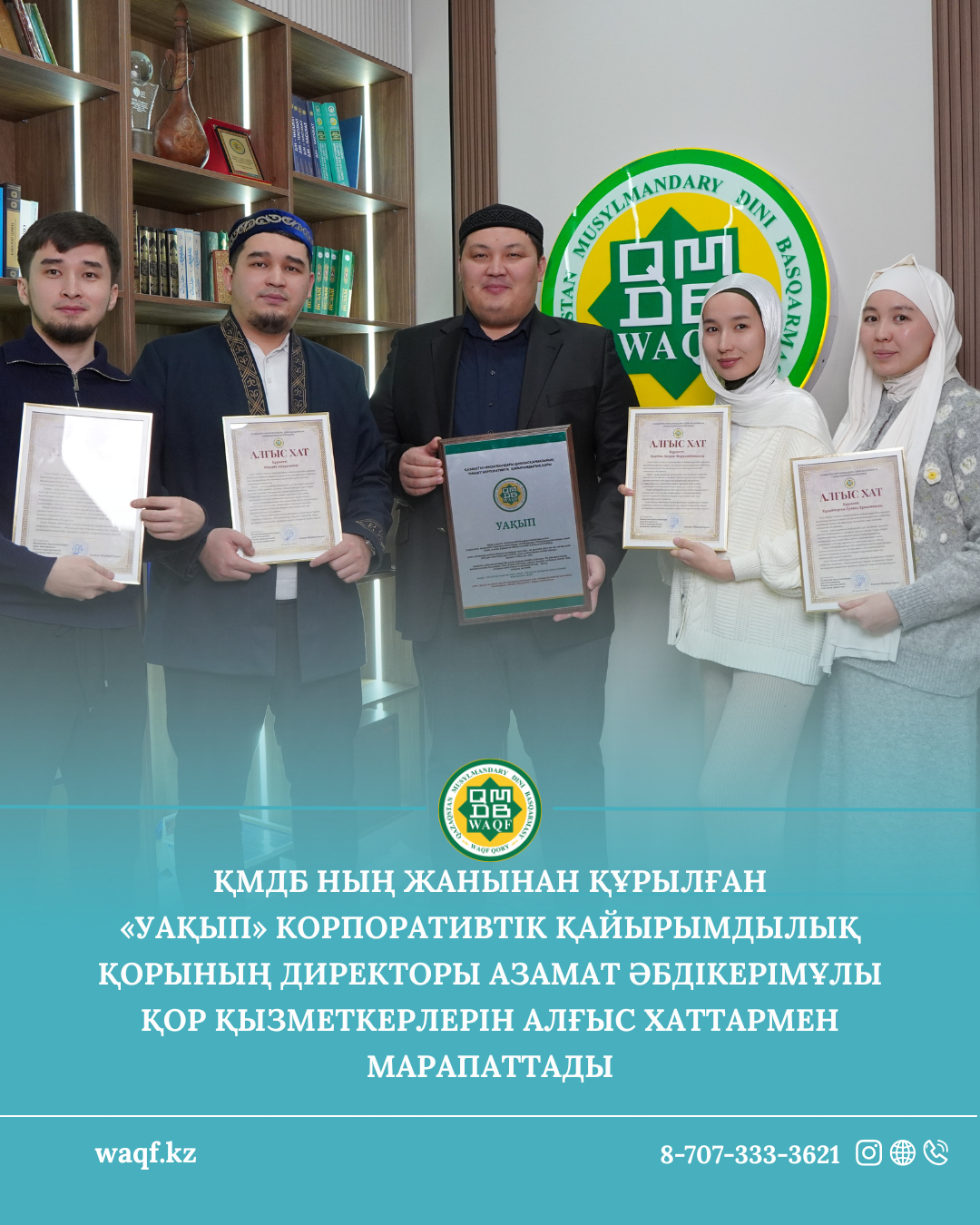 ҚМДБ ның жанынан құрылған «Уақып» корпоративтік қайырымдылық қорының директоры Азамат Әбдікерімұлы қор қызметкерлерін алғыс хаттармен марапаттады.