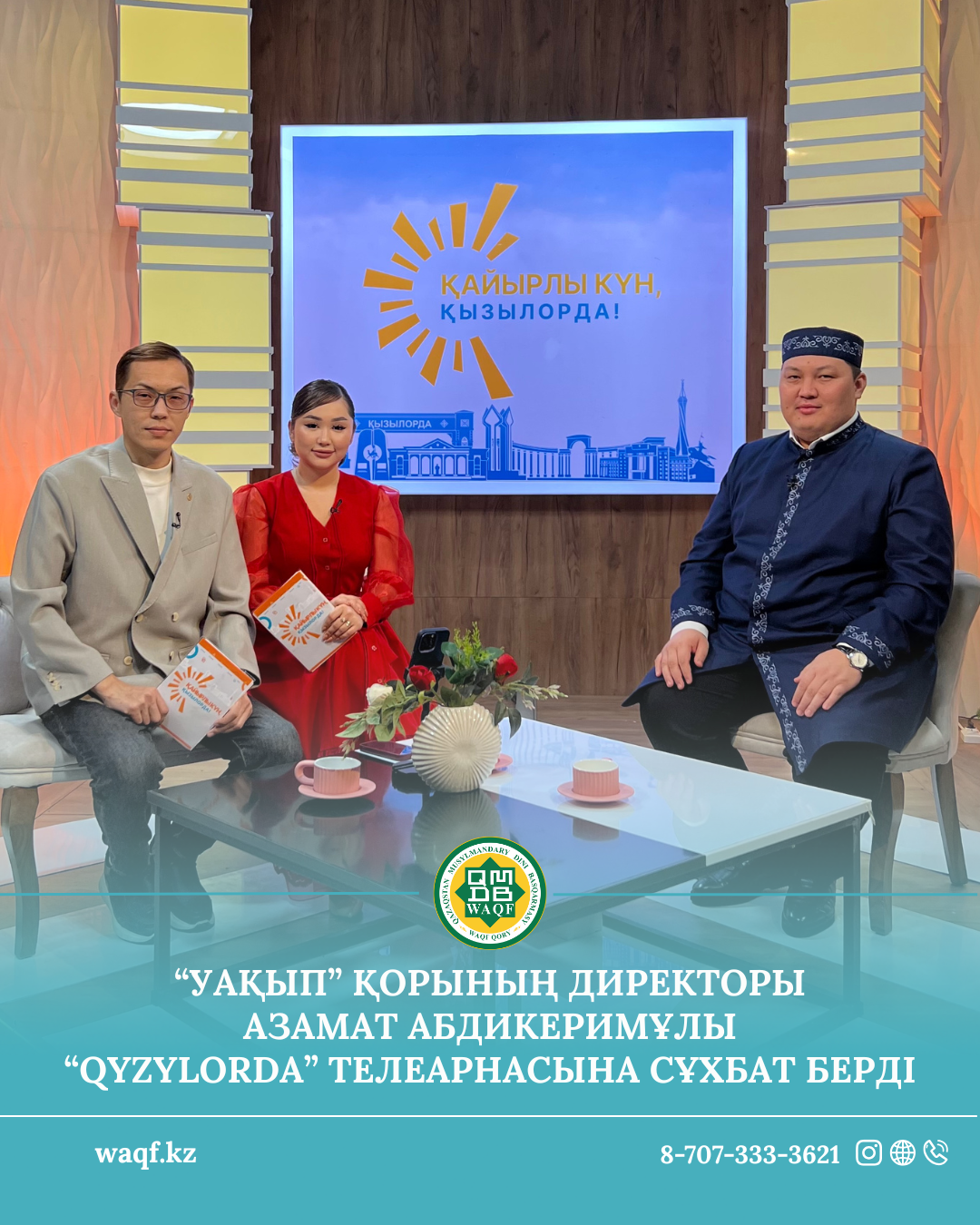Қазақстан мұсылмандары діни басқармасының жанынан құрылған «Уақып» корпоративтік қайырымдылық қорының директоры Азамат Әбдікерімұлы Қызылорда облыстық «Qyzylorda» телеарнасына және ҚМДБ-ның «Munara tv» телеарнасының аймақтық филиалына арнайы сұхбат берді.