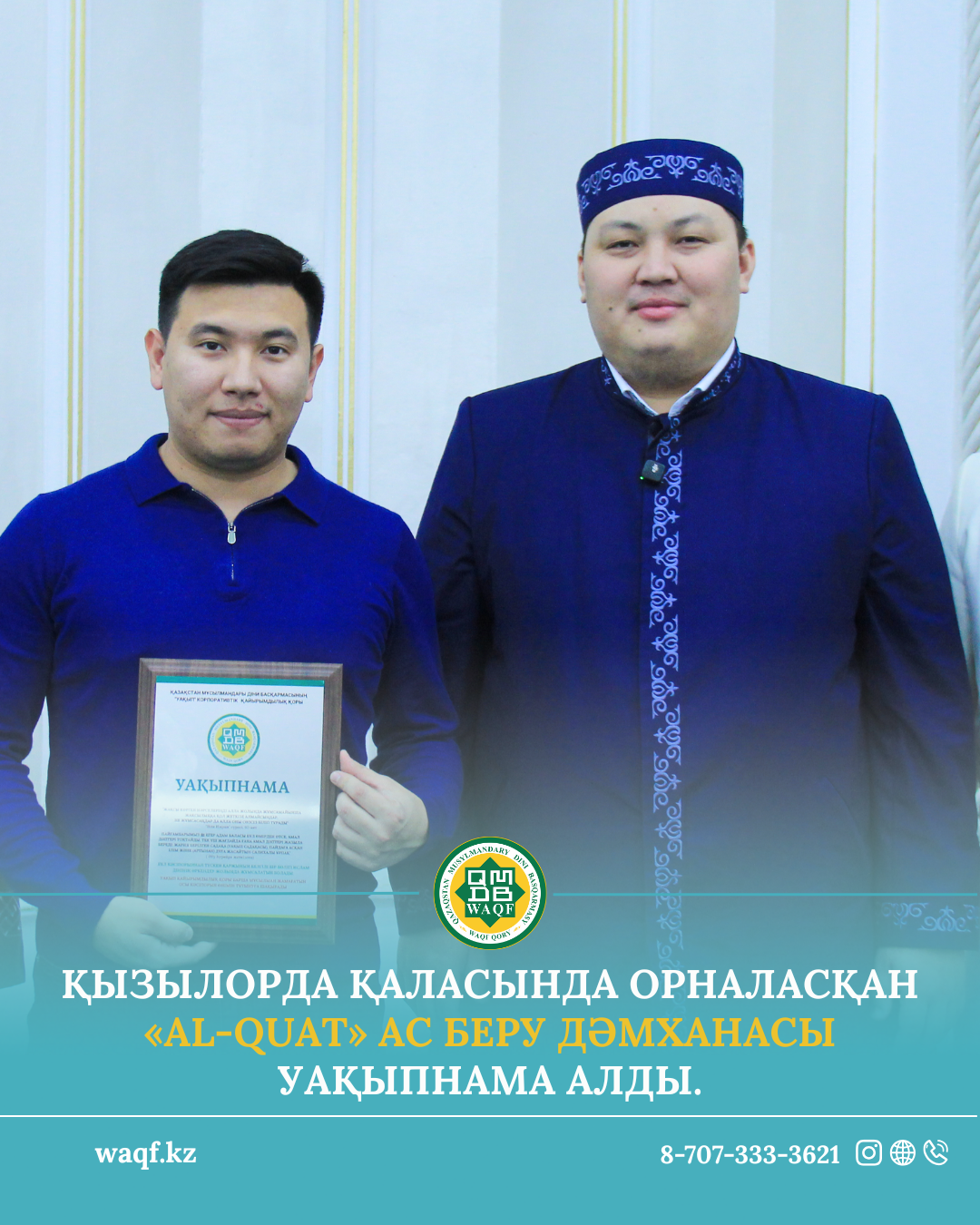 Уақыпнама сертификатын Сыр өңіріне жұмыс сапарымен келген Қазақстан мұсылмандары діни басқармасы жанынан құрылған «Уақып» корпоративтік қайырымдылық қорының директоры Азамат Әбдікерімұлы жергілікті жамағат алдында салтанатты түрде табыстады.