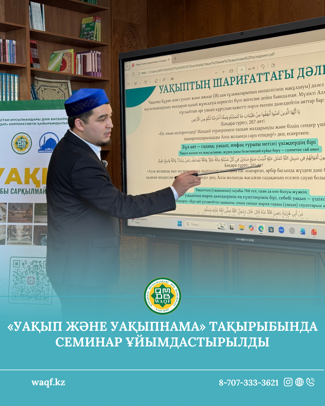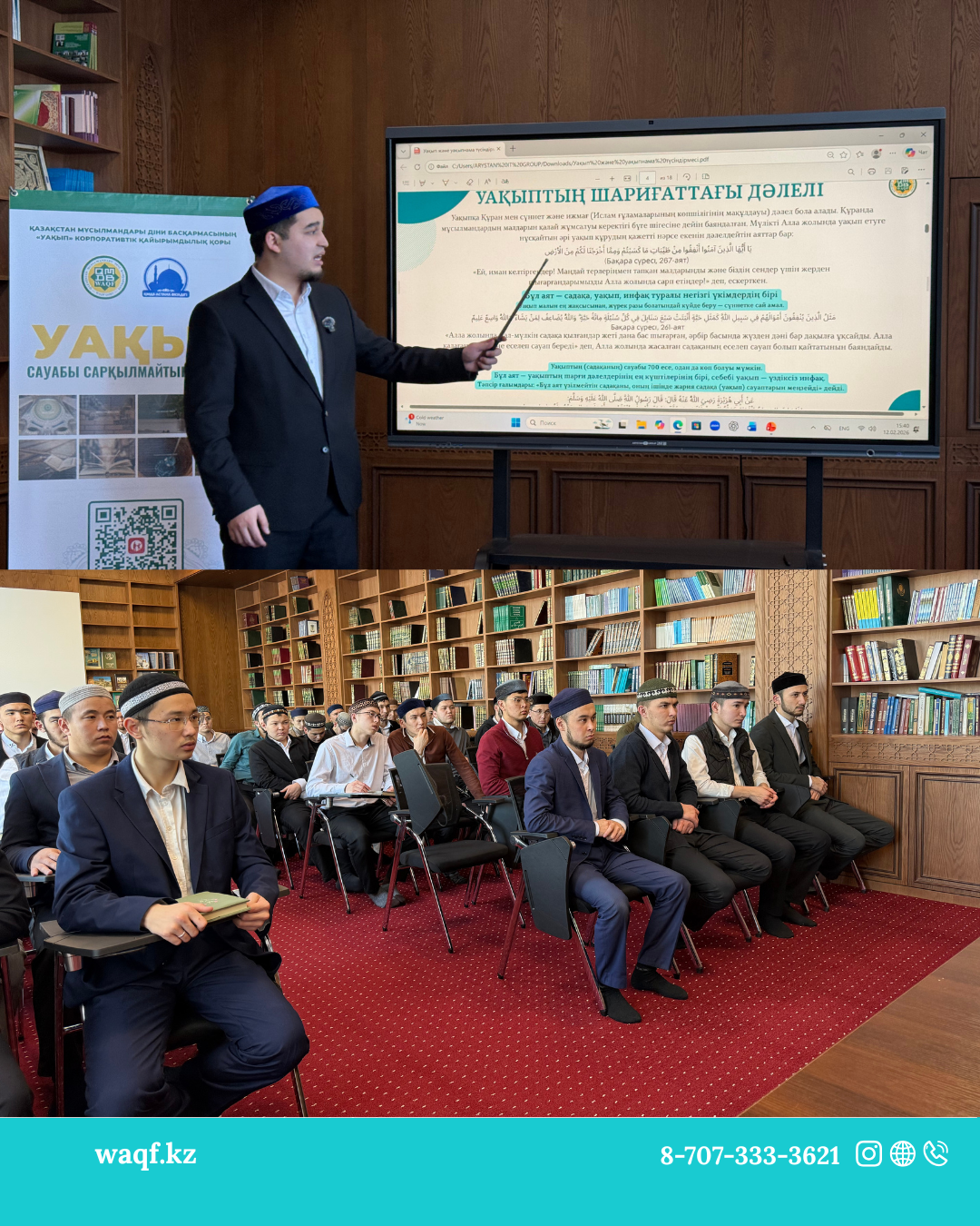 Семинарды қор директорының орынбасары Абдуайт Али жүргізіп, шәкірттерге Ислам дініндегі уақыптың мәні мен маңызы, оның шариғи негіздері, уақып жүйесінің жүзеге асу тәртібі, сондай-ақ әлемдік және Қазақстандағы уақып институтының даму тәжірибесі жөнінде жан-жақты түсіндірме берді.