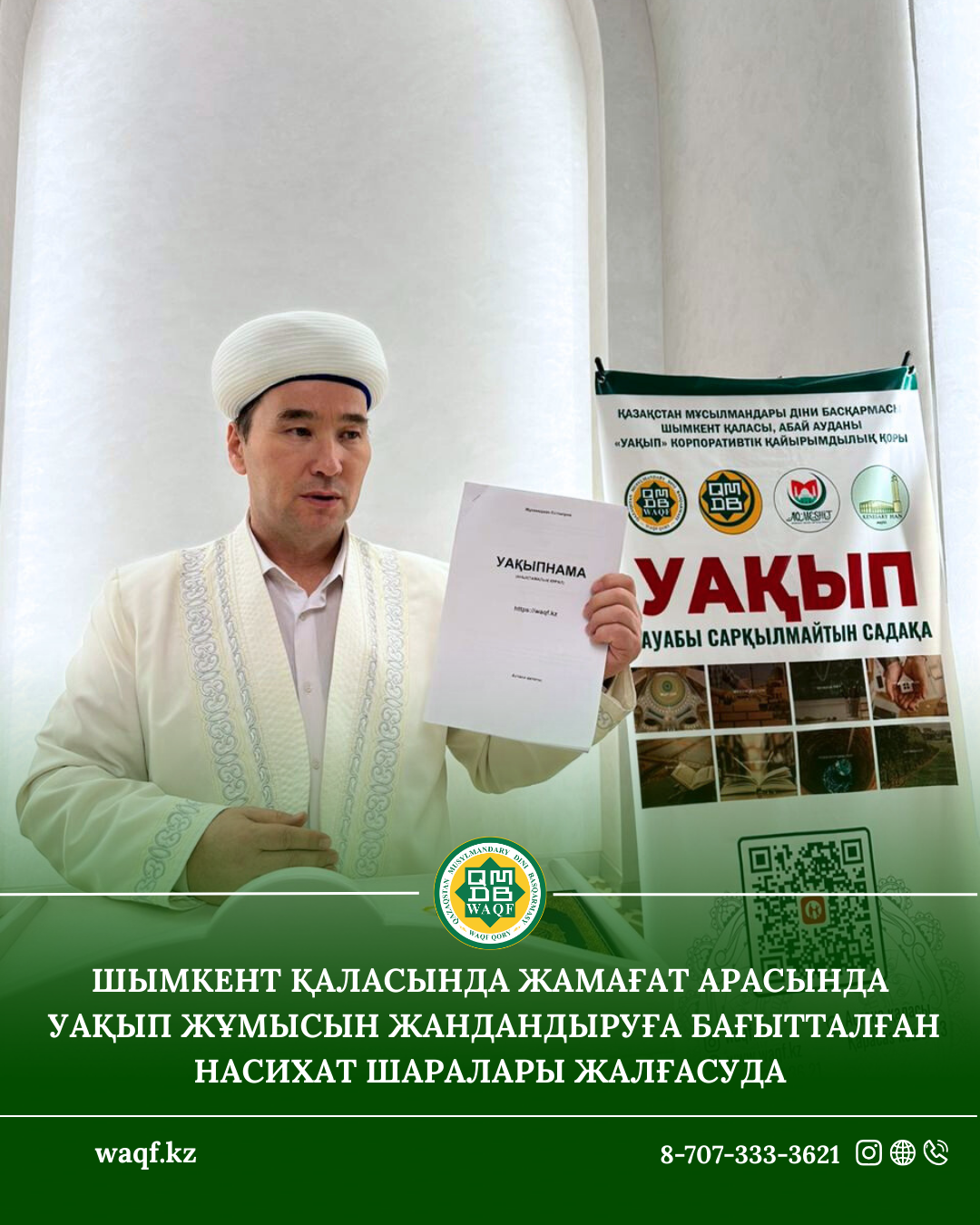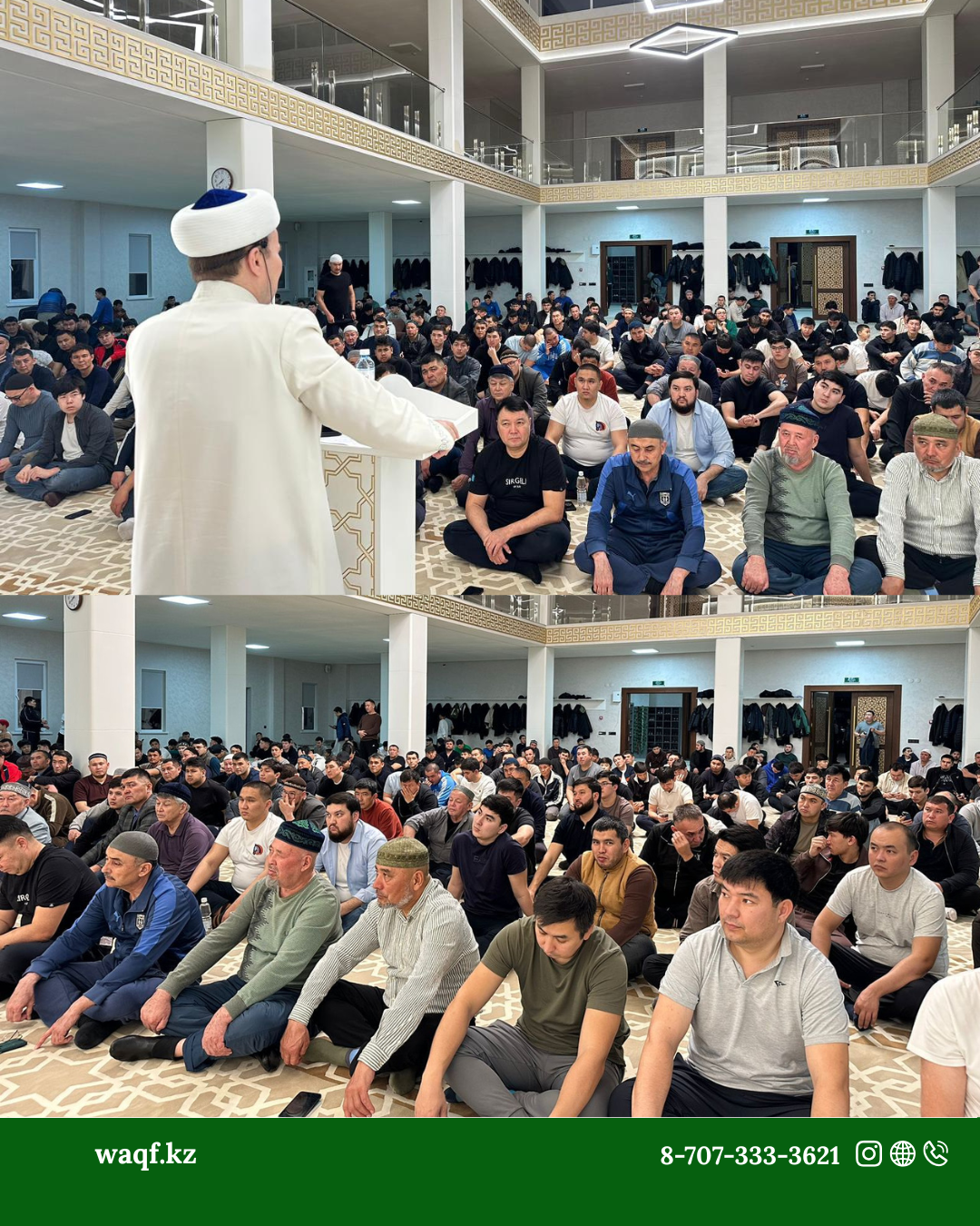 Қазақстан мұсылмандары діни басқармасының Төрағасы, Бас мүфти Наурызбай қажы Тағанұлы хазіреттің Бағдарлы баяндамасында белгіленген міндеттер аясында Шымкент қаласы Абай ауданындағы «Кенесары хан» мешітінде тарауих намазы қарсаңында «Уақып – сарқылмас қазына» тақырыбында тағылымды уағыз ұйымдастырылды.