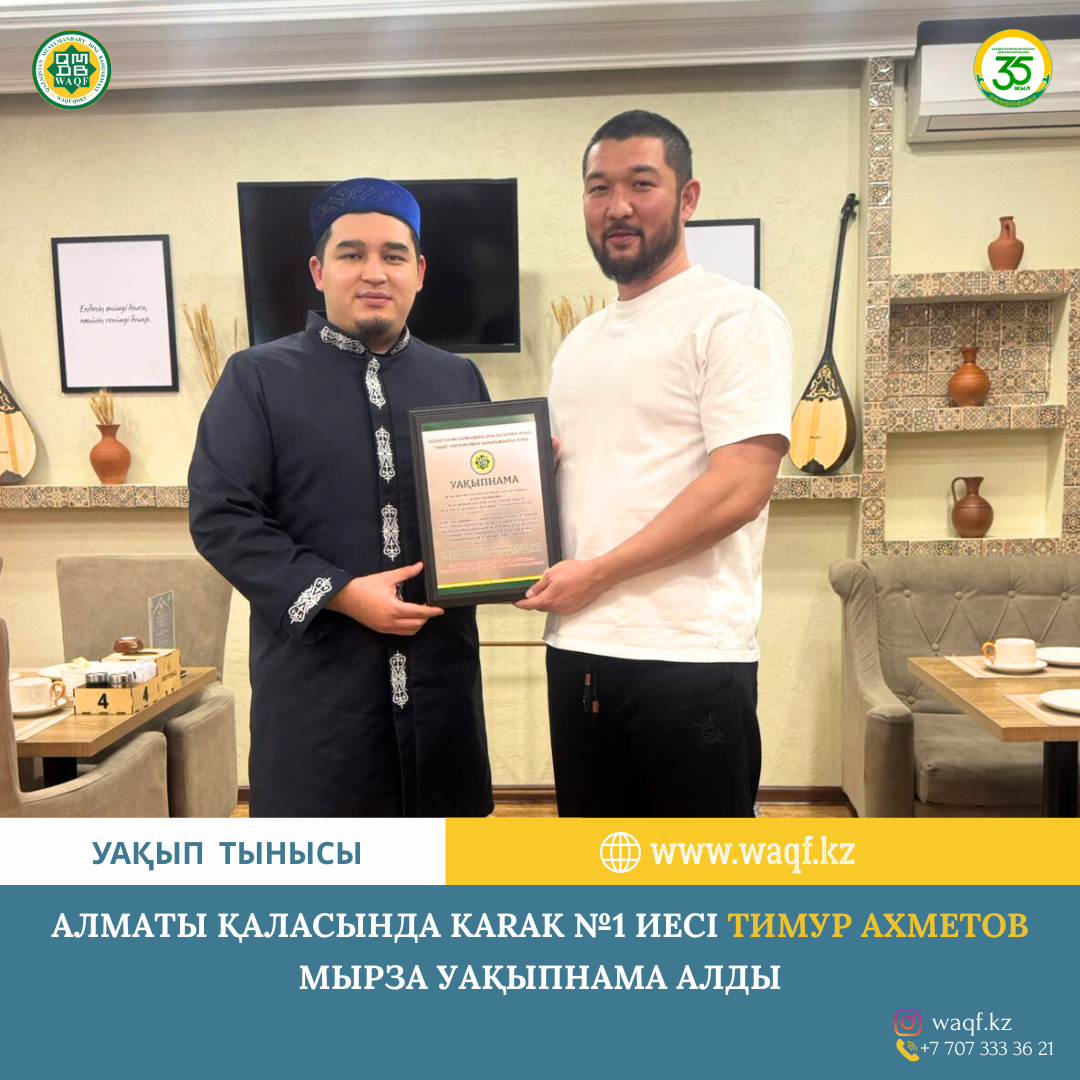 Алматы қаласында ҚМДБ-ның «Уақып» қайырымдылық қоры игі бастамаларын жалғастырып келеді. Соның аясында сапалы да пайдалы өнімімен танылған Karak.one бренді Karak №1 компаниясының иесі, кәсіпкер Ахметов Тимур мырзаға арнайы Уақыпнама куәлігі салтанатты түрде табысталды.